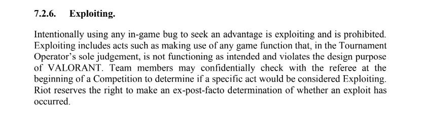 “Usar intencionalmente qualquer bug do jogo para buscar uma vantagem é uma exploração e é proibido. Explorar inclui atos como fazer uso de qualquer função do jogo que, no julgamento exclusivo do Operador do Torneio, não está funcionando como pretendido e viola o propósito do projeto de VALORANT. Os membros da equipe podem verificar confidencialmente com o árbitro no início de uma Competição para determinar se um ato específico seria considerado Exploração. A Riot reserva-se o direito de determinar ex-post-facto se uma exploração ocorreu”.