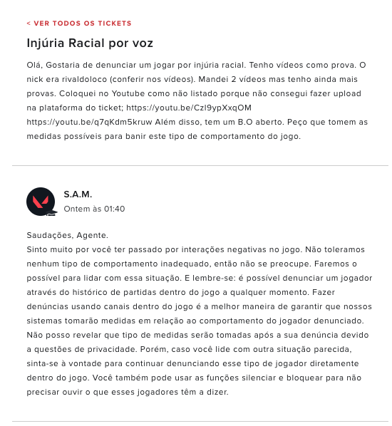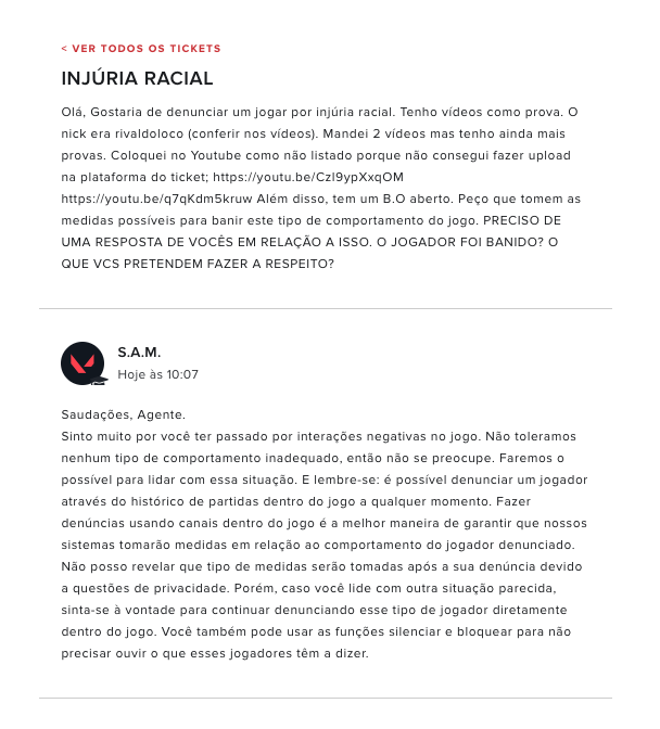Categórico, o jogador afirma que prontamente reportou os agressores e abriu dois tickets no suporte disponibilizado pela Riot Games, relatando a injúria racial que sofreu na partida. Mas de acordo com Guilherme, ambos foram respondidos pela mesma pessoa e de forma automática.