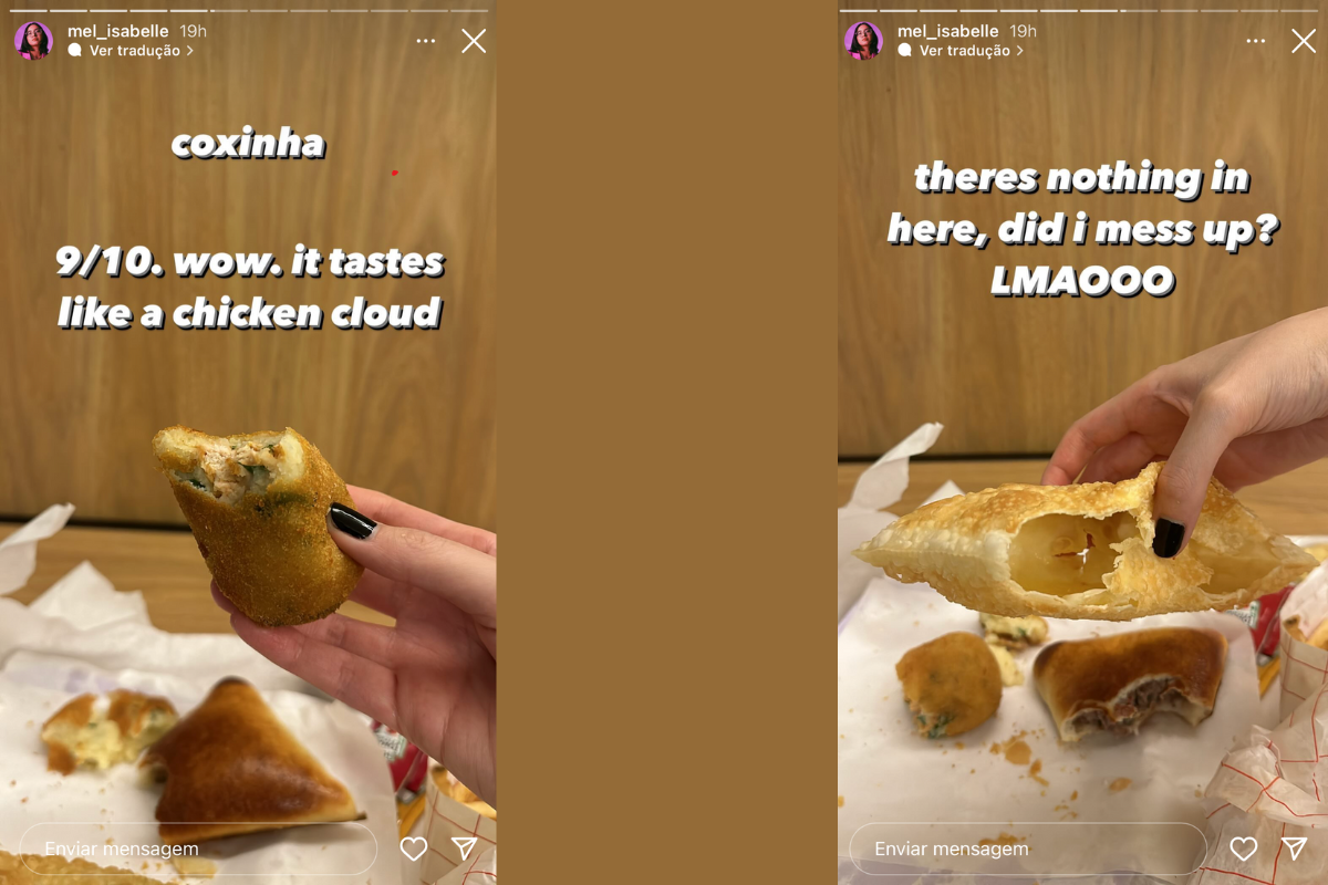 MeL também experimentou um pastel de queijo muçarela. A jogadora brincou com a ausência de recheio no lanche, dando nota 7. Ela chega a dizer “que não tem nada dentro” do salgado e pergunta se fez alguma besteira. Entretanto, m outro story MeL afirma que encontrou o queijo no pastel, mas que preferiria que o mesmo tivesse mais recheio.