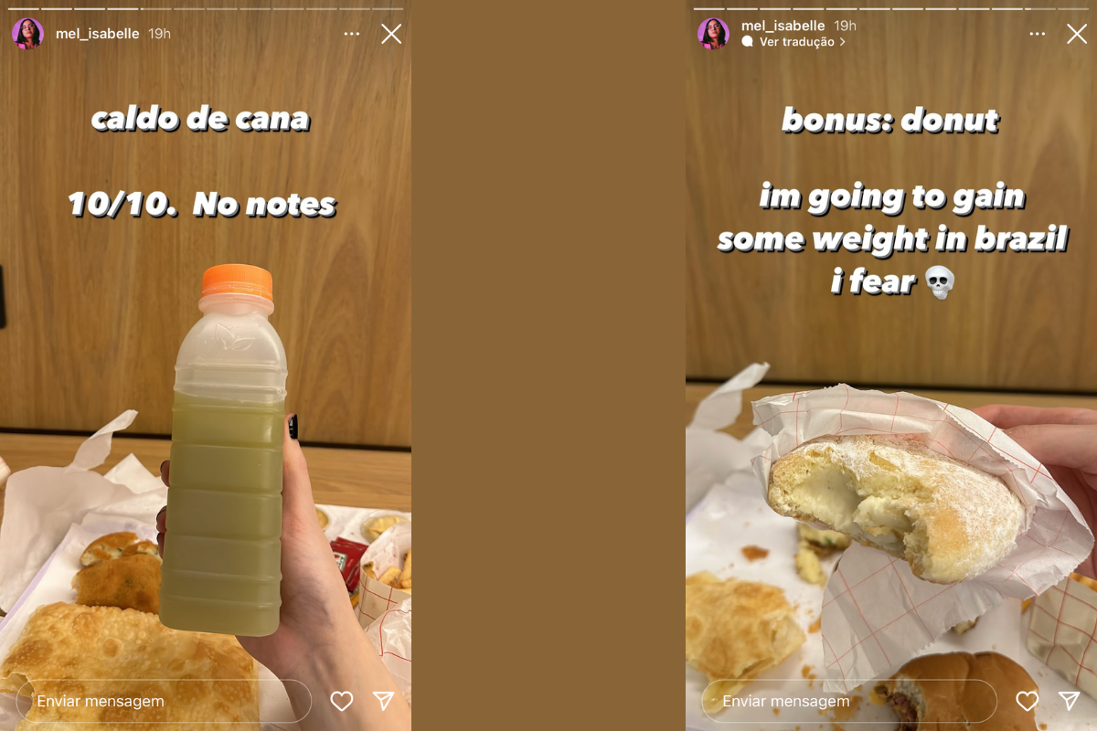 A jogadora publicou em seus stories uma avaliação dos lanches brasileiros que consumiu. O primeiro deles foi o caldo de cana, ao qual atribuiu nota 10. Na sequência, Melanie experimenta alguns salgados. O primeiro foi uma coxinha, a quem deu chamou de “nuvem de frango” e deu a nota 9. Na sequência, experimentou uma esfiha fechada de carne, associando o lanche a fatayas, que são “tortas de carne libanesas”, explicou a atleta. A nota para o salgado foi 8.