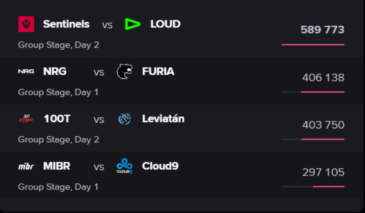 O jogo entre LOUD e Sentinels no último sábado (17) bateu o recorde de audiência do VCT Américas 2024 Kickoff até aqui. A partida teve quase 600 mil espectadores simultâneos, ultrapassando a marca atingida na partida entre NRG Esports e FURIA. A série terminou com uma vitória da LOUD por 2 a 0, classificando a equipe para a próxima rodada, onde jogará contra a Leviatán.