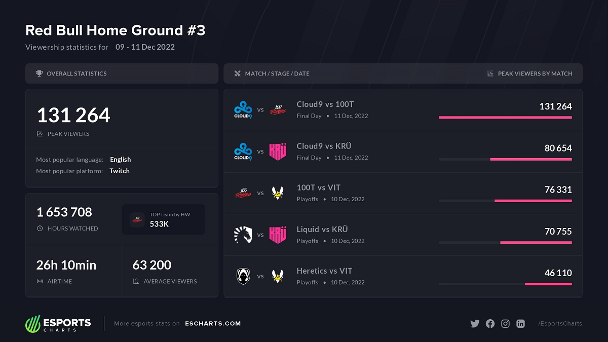 O Red Bull Home Ground 3 acabou neste domingo (11) com a vitória da 100 Thieves em cima da Cloud9. A decisão foi o jogo mais assistido no campeonato, mas a semifinal entre C9 e KRÜ Esports, equipe dos brasileiros Alexandre “xand” Zizi e Carlos “axeddy” Galvão, foi a 2ª partida mais popular, segundo o Esports Charts.