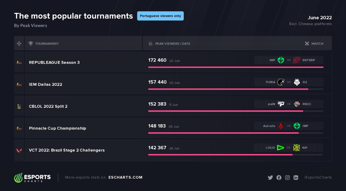 O Esports Charts chegou a registrar que pouco mais de 142 mil dispositivos se conectaram ao mesmo tempo para assistir ao duelo. O número fez com que o confronto válido pelo Challengers Brasil fosse o único da modalidade de VALORANT a aparecer na lista.