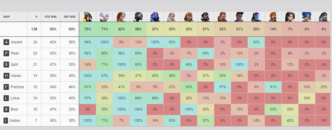 As estatísticas mostram que a personagem apareceu em 75% dos confrontos, sendo que nos mapas Haven e Icebox a Killjoy teve uma taxa de 100% de utilização. Na segunda posição aparece a Jett, agente preferida dos duelistas. A personagem foi usada em 71% das partidas, mas só teve 100% de utilização no mapa Ascent.