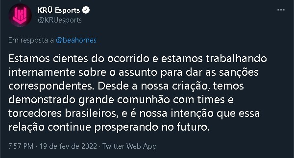 Beatriz também disse que “aqui e em qualquer lugar do mundo é intolerável essa conduta”, e também falou que aguardava contato da organização e dos jogadores. A KRÜ respondeu a publicação de Beatriz: “Estamos cientes do ocorrido e estamos trabalhando internamente sobre o assunto para dar as sanções correspondentes. Desde a nossa criação, temos demonstrado grande comunhão com times e torcedores brasileiros, e é nossa intenção que essa relação continue prosperando no futuro”.