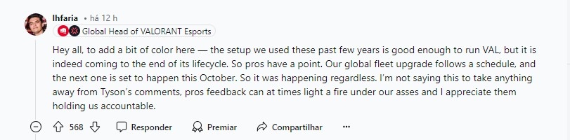 “Pessoal, para esclarecer um pouco as coisas. A configuração que usamos nos últimos anos é boa o suficiente para rodar o VALORANT, mas ela está realmente chegando ao fim do seu ciclo de vida. Então, os jogadores profissionais têm razão”, iniciou.