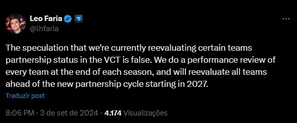 Líder global do VALORANT, Leo Faria negou que a Riot Games esteja reavaliando a permanência de equipes no Sistema de Franquias. O brasileiro publicou a informação no seu perfil pessoal do X (antigo Twitter) nesta terça-feira (3).
