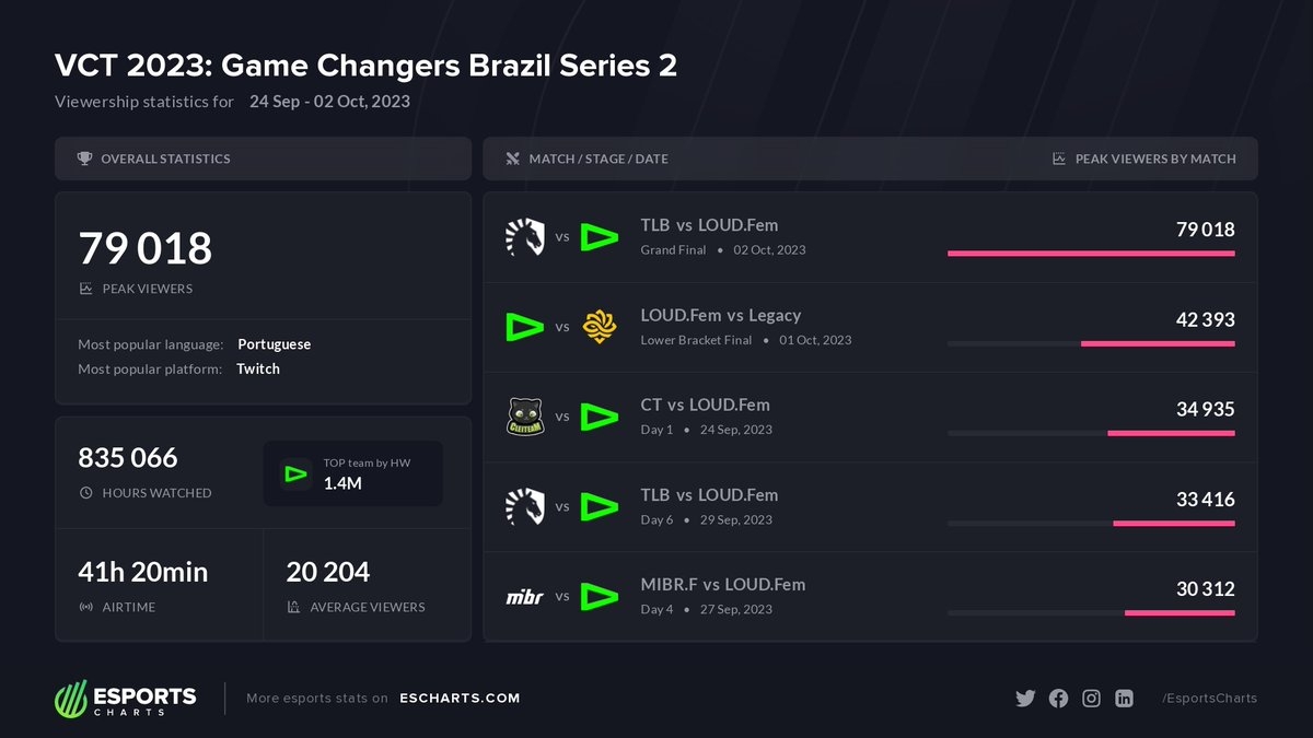 A grande final entre Team Liquid e LOUD no Game Changers Series 2 Brasil 2023 foi a partida mais assistida da competição. O jogo teve mais de 79 mil espectadores simultâneos na transmissão, segundo o Esports Charts.