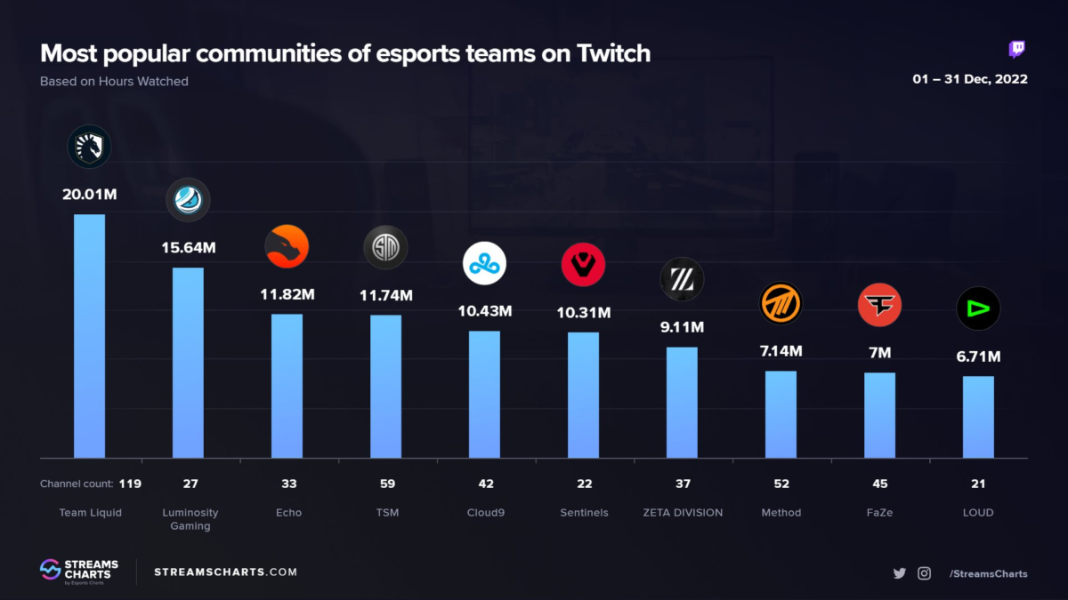 Quem liderou o ranking no mês passado foi a Team Liquid com 20.01 milhões de horas assistidas e contou com 119 canais participantes na comunidade, que são canais de streamers ou oficiais da organização para transmitir eventos ou campeonatos.