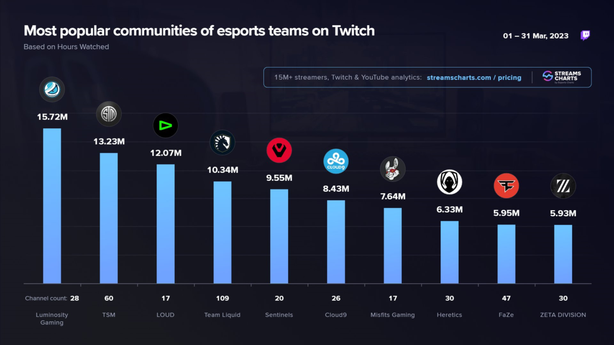Na listagem do ranking, a LOUD apareceu com 17 canais ativos que estão ligados ao clube, eles podem ser de jogadores ou streamers da organização. Em 4º lugar ficou a Team Liquid com 10,34 milhões de horas assistidas e 109 canais.