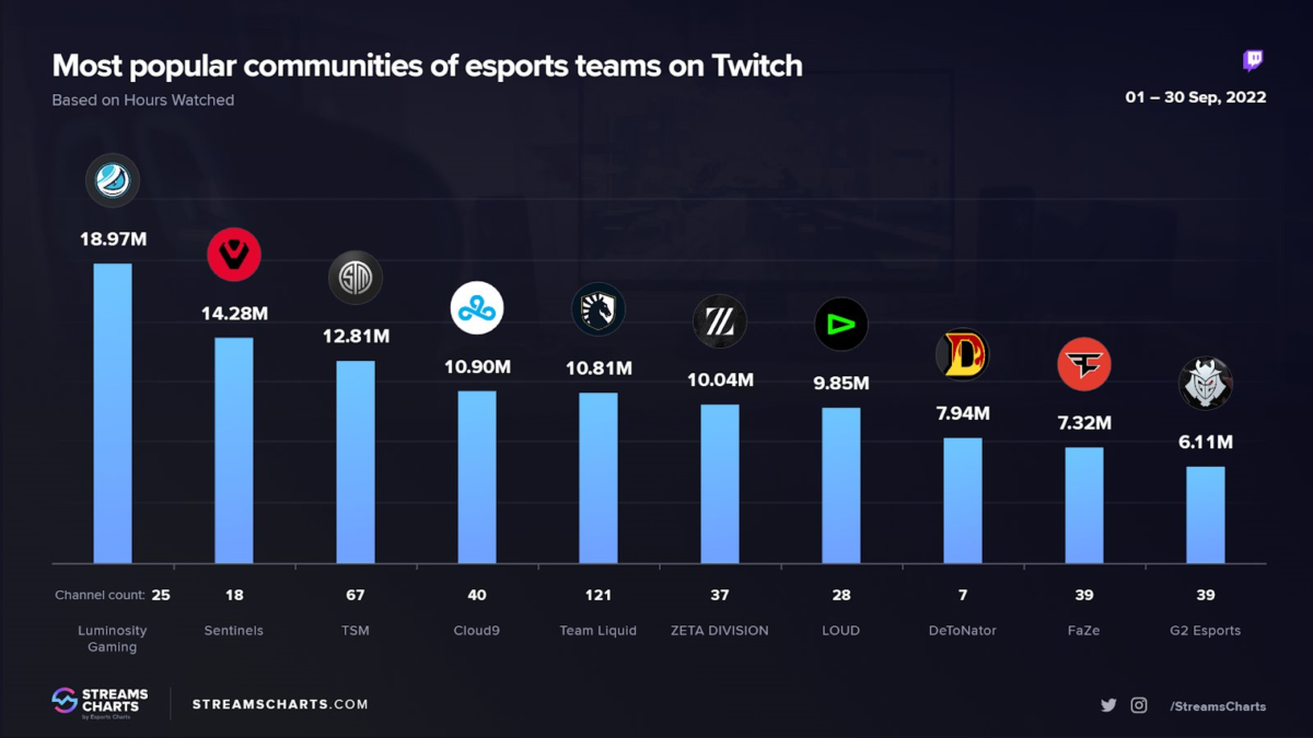 A LOUD, que é a única organização brasileira na lista, aparece na parte de baixo da lista em 7º lugar com 9.85 milhões de horas assistidas com 28 canais ativos na Twitch. Porém, o time esmeraldino atual campeão do Champions, ficou na frente de grandes clubes como FaZe Clan e G2 Esports.