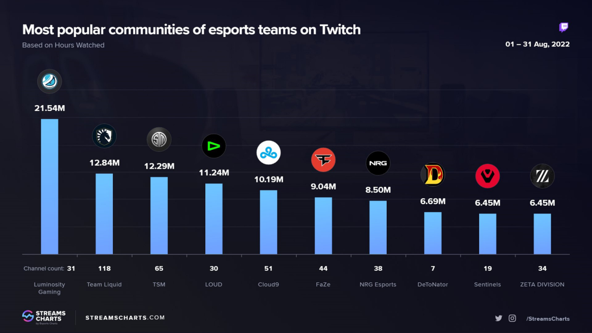 Quem liderou a lista foi a Luminosity Gaming com mais de 21.54 milhões de horas assistidas, em 2º lugar ficou a Team Liquid com 12.84 milhões, a organização tem um time misto no cenário europeu de VALORANT e uma equipe feminina brasileira, atual campeã do Game Changers Series 1 Brasil 2022.