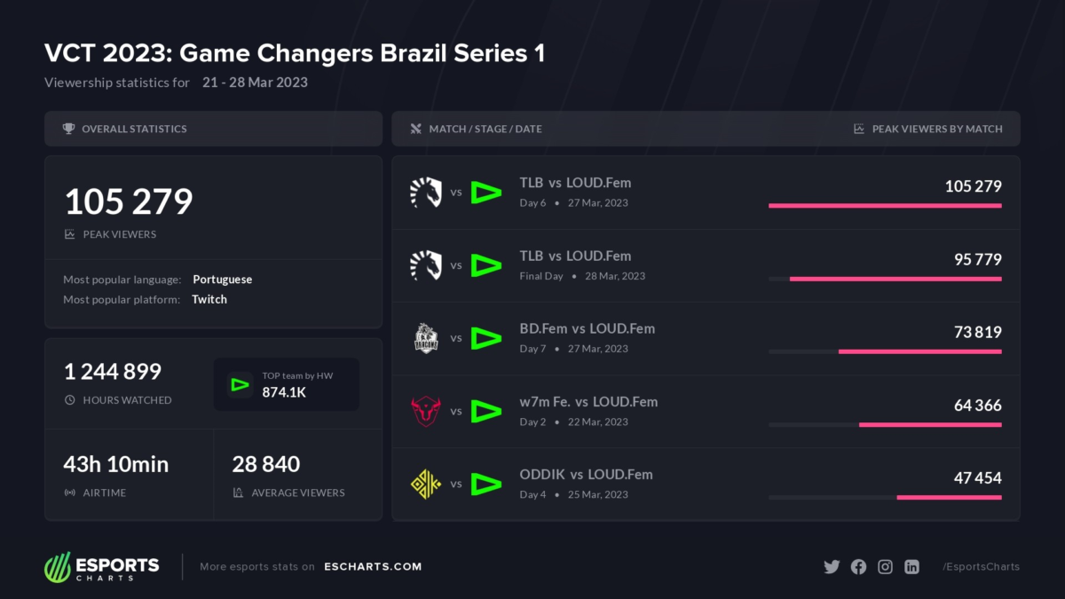 O Game Changers Series 1 Brasil 2023 foi um dos campeonatos de maior sucesso no país. Segundo Esports Charts, a final da chave superior foi a partida mais assistida, o duelo entre LOUD e Team Liquid teve um pico de mais de 105 mil espectadores simultâneos.