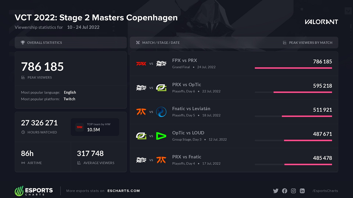 O Brasil caiu cedo no VALORANT Masters Copenhagen 2022, contudo, deixou uma marca positiva. O jogo de vida ou morte entre LOUD e OpTic Gaming na fase de grupos, foi um dos jogos com maior número de espectadores da competição. O jogo teve um pico de 487.671 viewers simultâneos, de acordo com o Esports Charts.