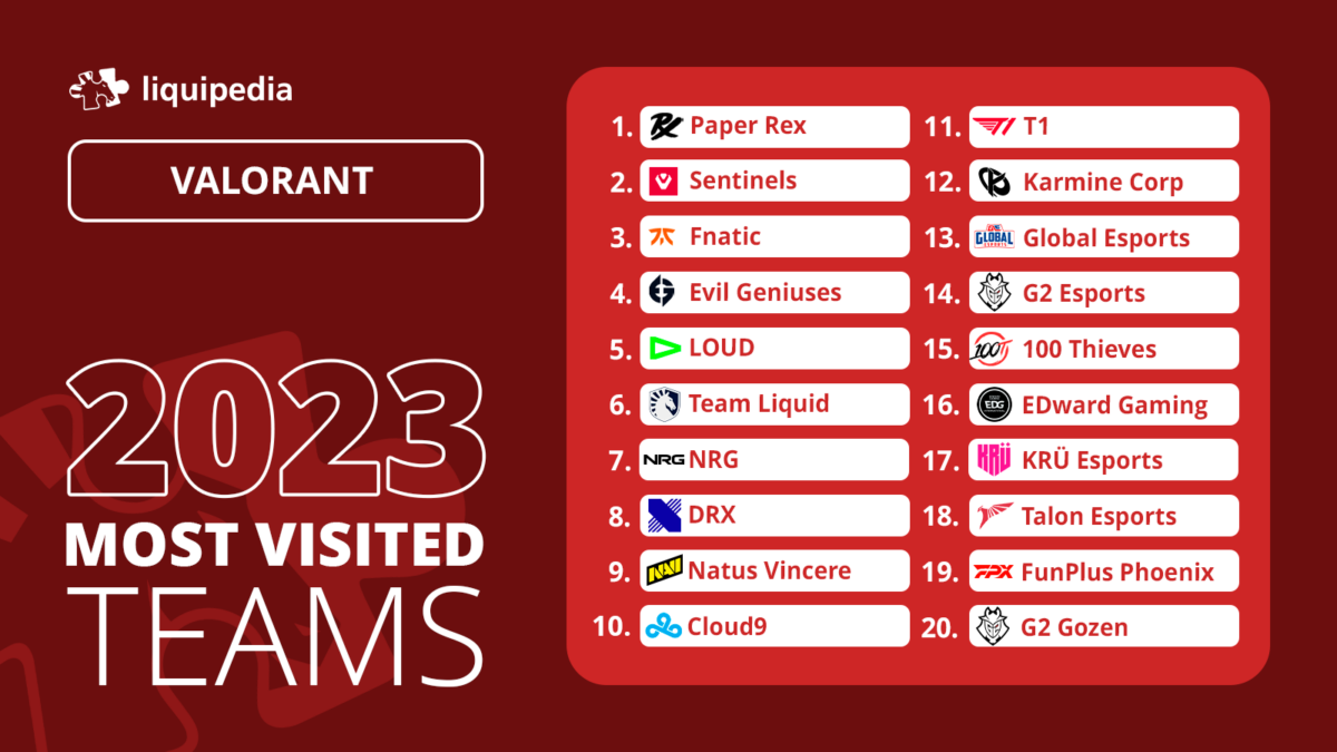 A equipe mais buscada, Paper Rex, foi campeã do VCT Pacífico e chegou a final do Champions 2023 sem perder nenhuma série. FNATIC e Evil Geniuses também se destacaram no último ano, com a primeira sendo campeã do Masters Tokyo, enquanto a última conquistou o principal torneio da temporada. A Sentinels, por outro lado, é bastante popular entre os fãs do jogo, ainda que tenha obtido poucos resultados em 2023.