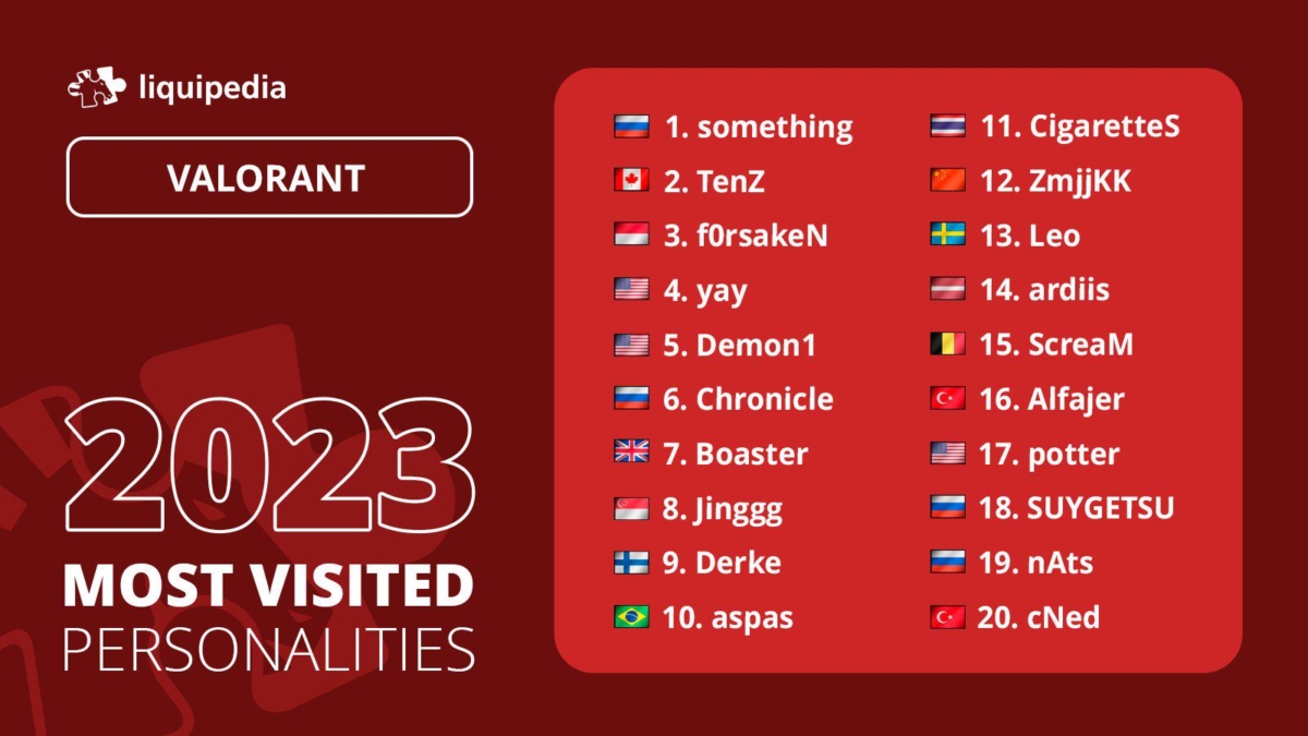Something, Tyson “TenZ” Ngo e Jason “f0rsakeN” Susanto encabeçaram a lista, sendo os três jogadores mais buscados no portal em 2023. Jogando pela Sentinels desde 2021, TenZ se tornou o rosto da organização norte-americana no VALORANT, figurando entre os atletas mais populares do mundo. F0rsaken, por outro lado, é colega de equipe de Something e teve um ótimo desempenho no último ano jogando pela Paper Rex, time vice-campeão do Champions.