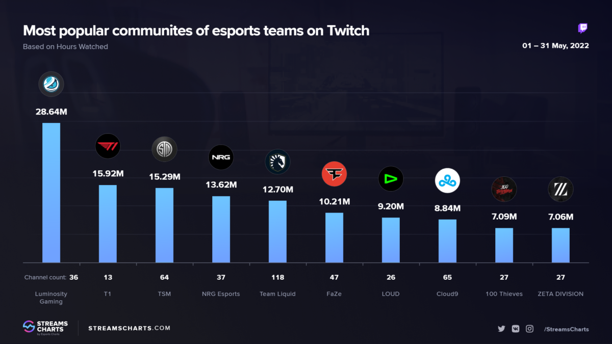 Para conseguir o feito, a LOUD contou com a ajuda de 26 jogadores e criadores de conteúdo que fazem transmissão na plataforma. Apesar do sucesso da organização brasileira, eles não conseguiram chegar perto da Luminosity Gaming, que liderou a lista de maneira disparada e ficou com 28,6 milhões de horas assistidas em maio.
