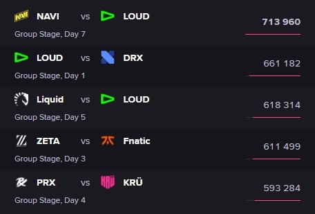 Na sequência, a partida da LOUD contra a DRX, que marcou a estreia da equipe brasileira na competição, contou com 661.182 espectadores simultâneos. Por fim, o confronto entre LOUD e Team Liquid foi o terceiro mais assistido da fase de grupos, com 618.314 espectadores.