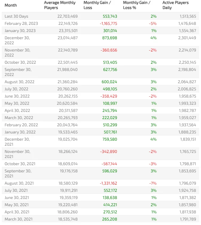 Os dados do Active Player mostram que a queda de mais de 1,1 milhão de jogadores ativos em VALORANT em fevereiro é a maior desde agosto de 2021, quando o game perdeu 1,3 milhão de usuários. Desde então, o número de jogadores ativos cresceu na maioria dos meses.