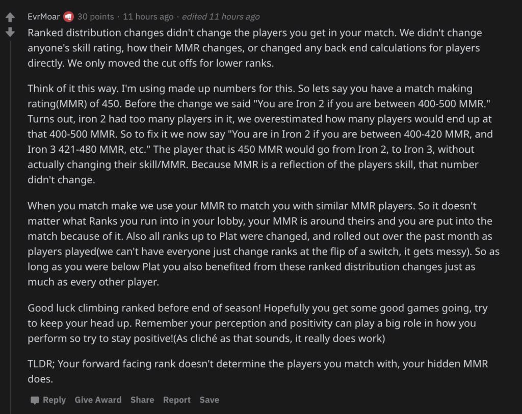 “Para corrigi-lo, dizemos que você está no Ferro 2 se tiver com 400 a 420 MMR e Ferro 3 se tiver 421 a 480 MMR. O jogador que tem 450 MMR iria de Ferro 2 para 3 sem realmente mudar a sua habilidade”, concluiu o Rioter no Reddit.