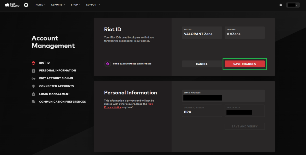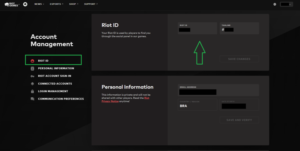 Após entrar com suas credenciais na página de “Gerenciamento de conta“, clique na aba RIOT ID, no canto esquerdo. Ao lado direito aparecerá suas informações. O primeiro campo (RIOT ID) consiste no seu nick e o segundo campo (TAGLINE), é a tag de jogador.