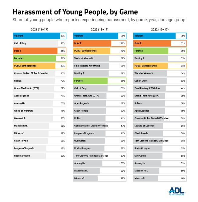 O trabalho feito pela ADL tem como intuito reportar e repudiar os casos de ódio e assédio sofridos por todos os jogadores dos games mais populares do mundo. No VALORANT, além da alta taxa de assédio sofrido por pessoas menores de 18 anos, 34% dos adultos passaram por exposição à ideologias extremistas de supremacia branca.
