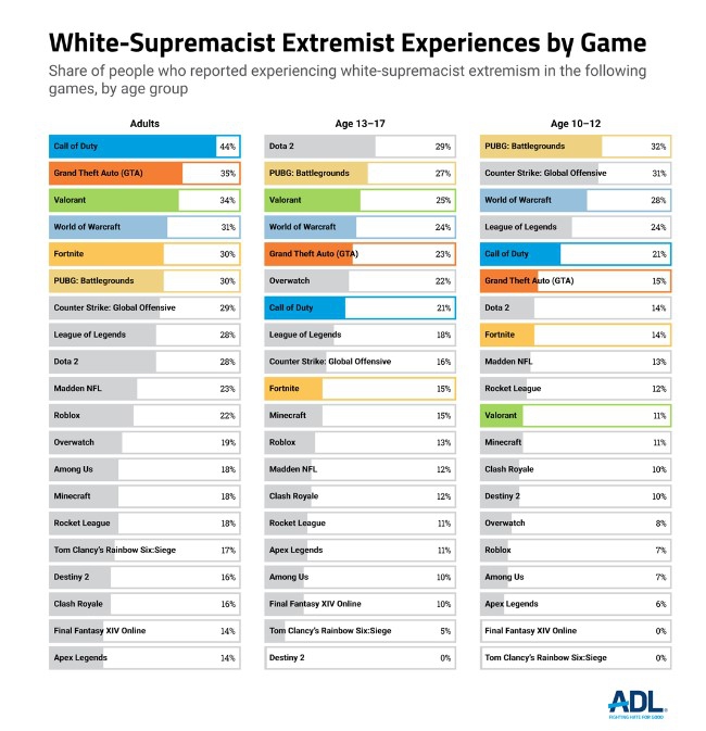 Além disso, de acordo com a ADL, estima-se que 2,3 milhões de adolescentes foram expostos à ideologia da supremacia branca em jogos multiplayer. O assédio e o ódio sofrido pelos jovens causa problemas tanto dentro, quanto fora dos servidores.