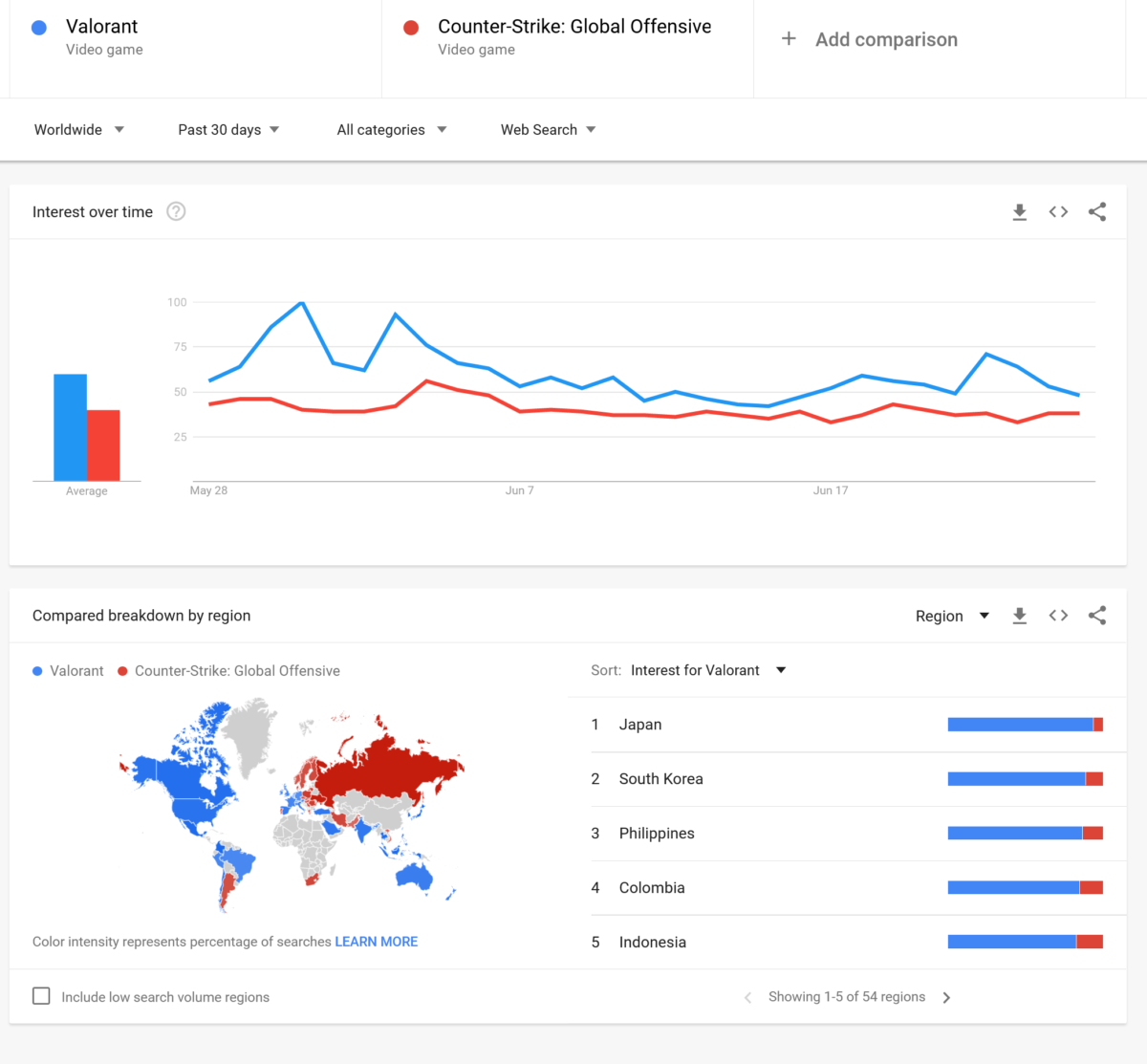 VALORANT ainda permaneceu a frente em grande parte da Europa, América do Norte e Oceania. Além disso, apareceu muito superior em países específicos se comparado ao Counter-Strike. A barra de pesquisa indica um interesse muito maior no jogo da Riot no Japão, Coréia do Sul, Filipinas, Colômbia e Indonésia. Neste primeiro, os japonses pesquisaram 91% VALORANT contra 9% do CS:GO.