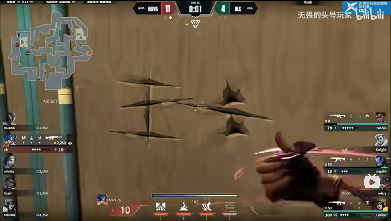 Em resumo, Nova vs Bilibili ocorreu na última sexta-feira (14), pelo VALORANT China Evolution Series Act 1, torneio que faz parte do circuito chinês de VALORANT. Com isso, cb aproveitou o final do round em que estava apenas guardando sua arma, para chamar o jogador da BBL, Wang “whiz” Haozhe, de “filho da p***” em chinês na parede da Pearl.