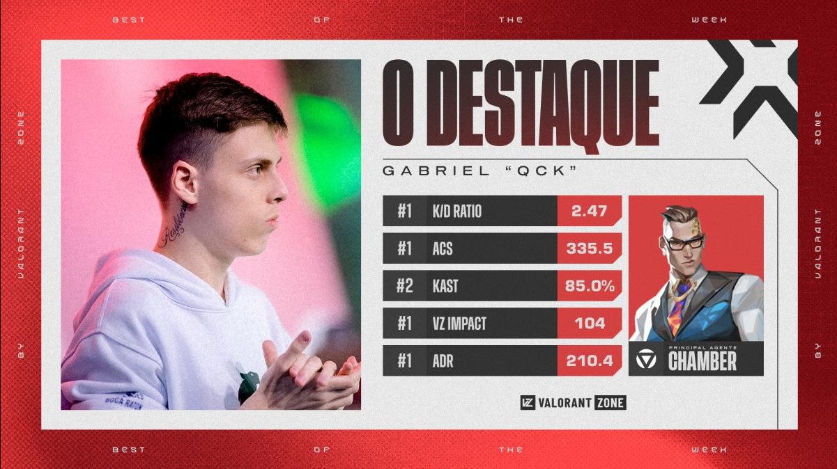 O atleta finalizou a série com incríveis 2.47 de KD, além de 335.5 de ACS (pontuação média de combate). Gabriel foi muito importante nos inícios de round, abrindo vantagem para a FURIA. Durante a série, o jogador pegou 11 first kills. Sendo assim, qck somou 104 VZ IMP, ficando com o primeiro lugar da semana.