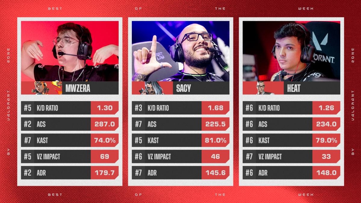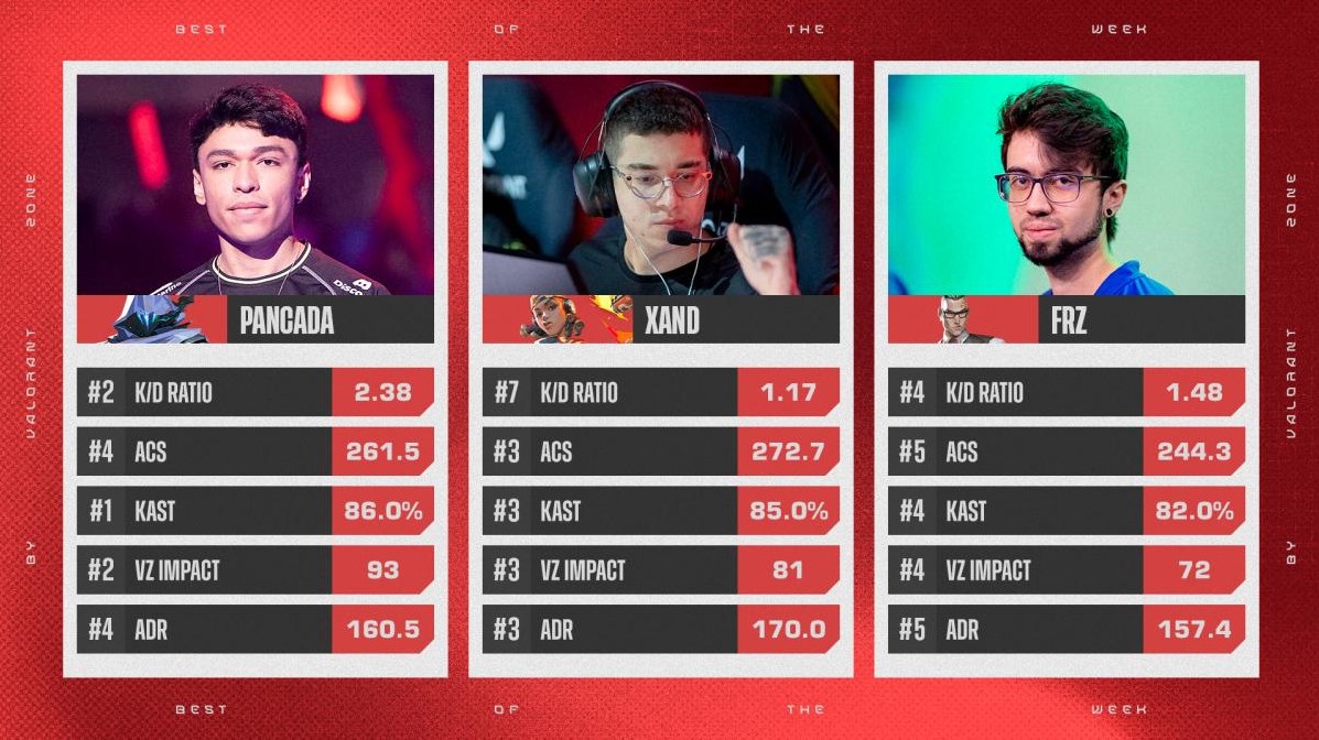 Como parte da cobertura da competição, o VALORANT Zone elege os destaques de cada semana do VCB. As escolhas são baseadas no VZone Impact, fórmula referente a análise de desempenho dos atletas, e também nas estatísticas do thespike.