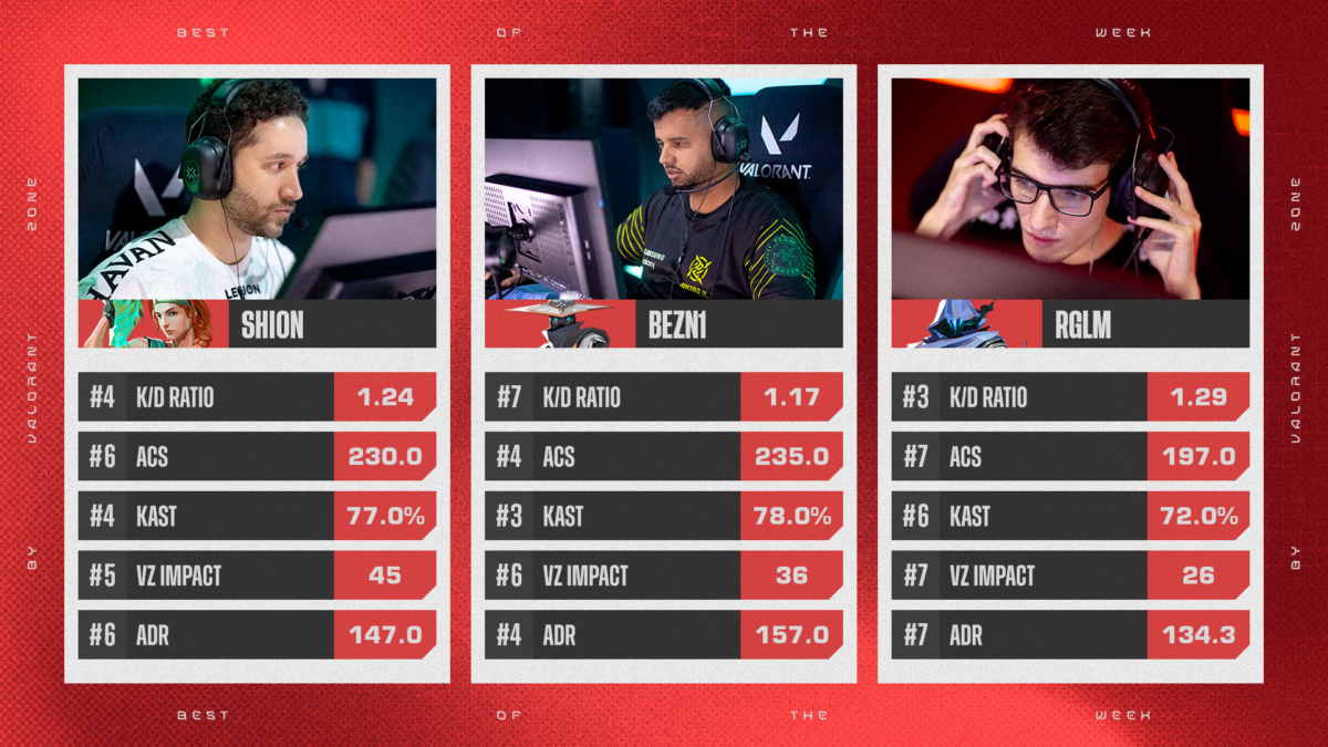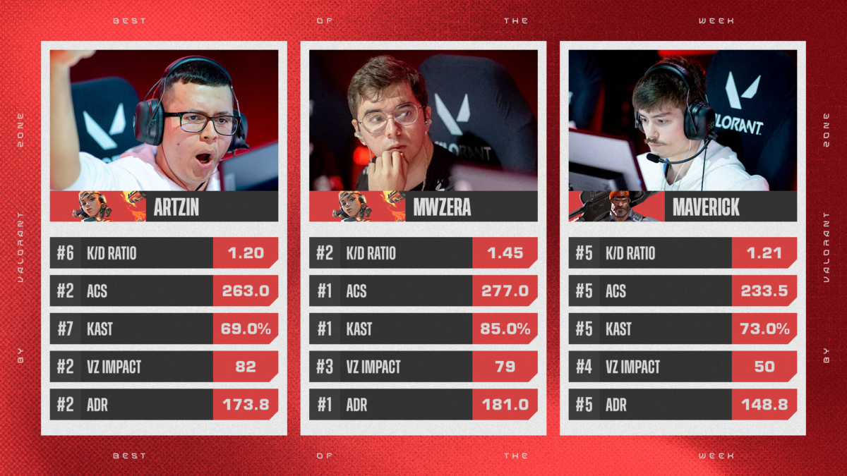 Como parte da cobertura da competição, o VALORANT Zone elege os destaques de cada semana do VCB. As escolhas são baseadas no VZone Impact, fórmula referente a análise de desempenho dos atletas, e também nas estatísticas do thespike.
