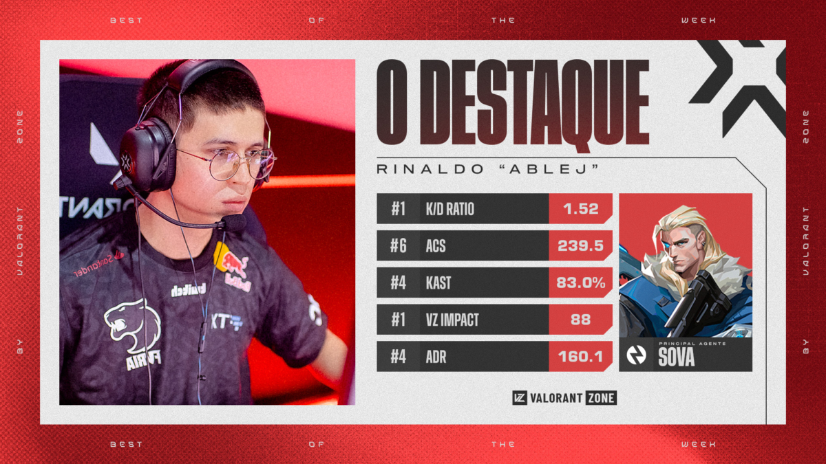 O atleta aparece em primeiro lugar na estatística de KD, com 1.52. Além disso, teve 83% de KAST e 239.5 de ACS (pontuação média de combate). Sendo assim, o jogador somou 88 VZ IMP e aparece como o grande destaque da terceira rodada do VCB.