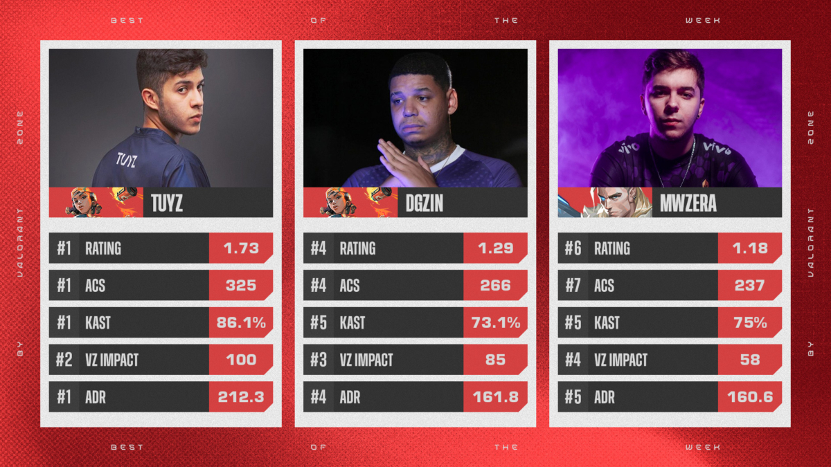 Como parte da cobertura da competição, o VALORANT Zone elege os destaques de cada semana do VCB. As escolhas são baseadas no VZone Impact, fórmula referente a análise de desempenho dos atletas produzida pela redação, e também nas estatísticas do thespike.