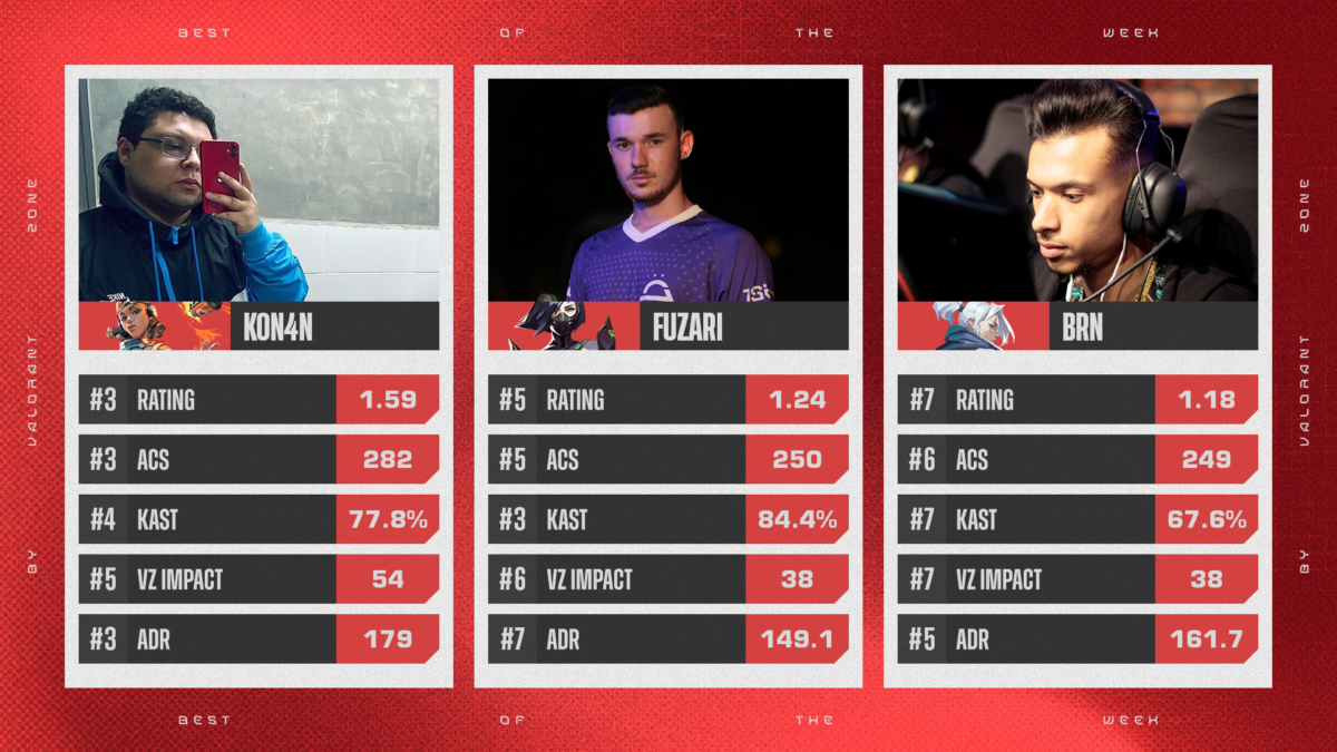 Na rodada passada, kon4n fechou a série com a terceira melhor estatística de todas as partidas do final de semana. O jogador teve 1,59 de rating, além de 282 de ACS (pontuação média de combate) e 179 de ADR.