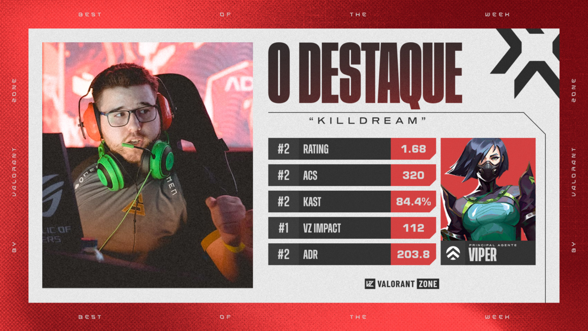 Pela primeira vez desde o começo do VALORANT Challengers Brasil 2022, João “KILLDREAM” Ferreira aparece na nossa lista de destaques da semana do campeonato. Nada melhor do que estrear sendo o grande MVP da rodada. O capitão da Sharks foi muito decisivo para sua equipe conseguir a primeira vitória no VCB 2022.