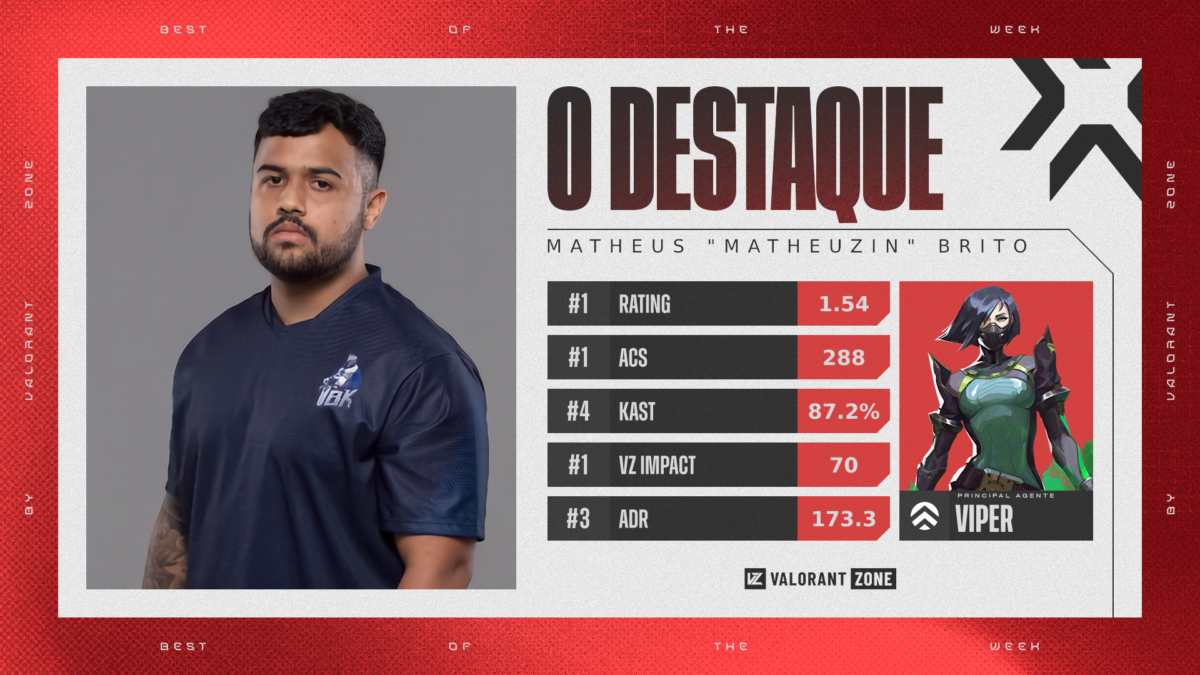 O jogador foi o grande destaque da partida e da rodada, tendo as melhores estatísticas em quase todos os quesitos. Matheus terminou a série com 1.54 de rating, 288 de ACS (pontuação média de combate) e 173.3 de ADR. Sendo assim, o atleta somou 70 VZ Points e ficou em primeiro na nossa lista.
