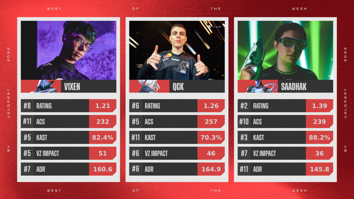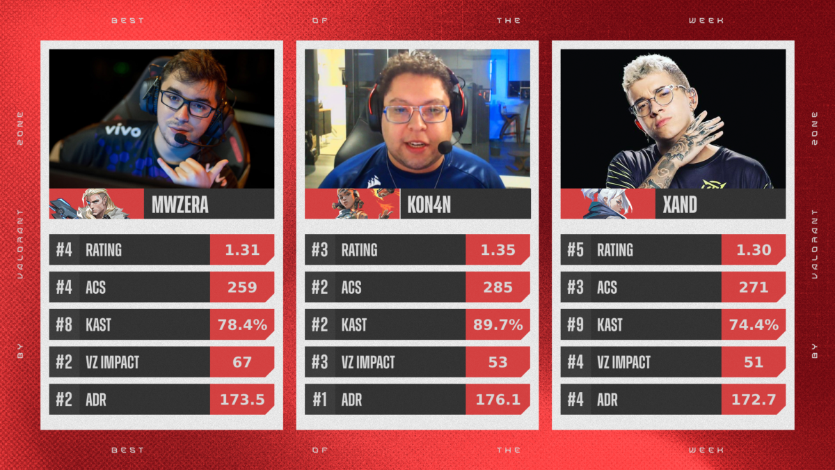 Como parte da cobertura da competição, o VALORANT Zone elege os destaques de cada semana do VCB. As escolhas são baseadas no VZone Impact, fórmula referente a análise de desempenho dos atletas, e também nas estatísticas do thespike.