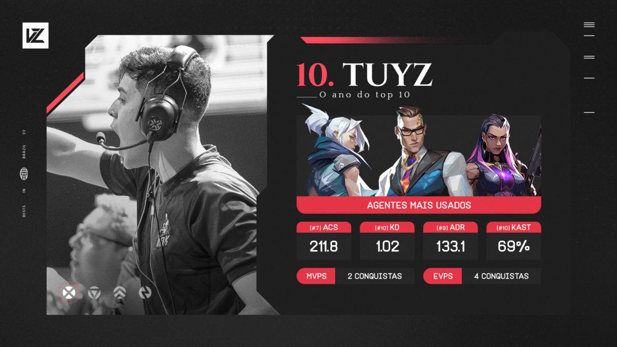 Este deve ser mais um dos mistérios da vida e cada um tem sua resposta. No caso de Arthur “tuyz” Vieira, cair não significou amadurecimento, mas sim, recomeçar o processo. Desta vez, pronto para desviar dos erros e deixar que as reações façam seu trabalho e o levem ao desenvolvimento. Por esse crescimento, tuyz é o 10º lugar no prêmio 10 Melhores do Ano de 2022 pelo VALORANT Zone.