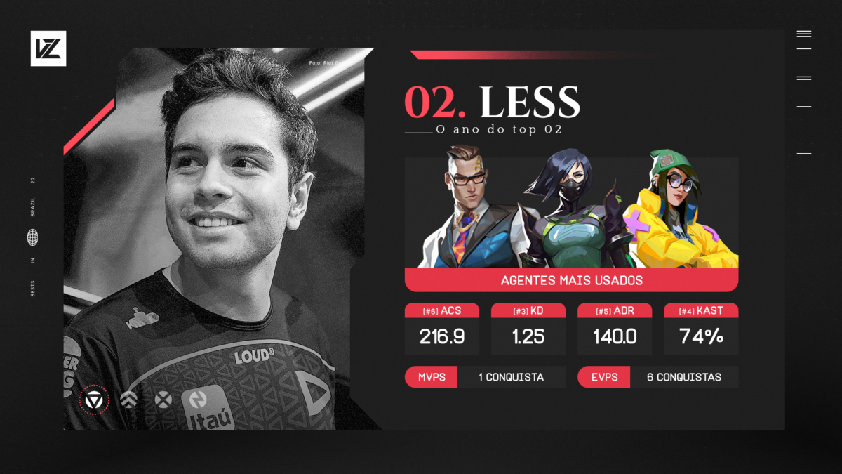São poucos jogadores na história do esporte que atingem um alto nível com tão pouca idade e ser campeão do mundo com 17 anos é só para Less e Pelé. Agora, só o tempo dirá se ele se tornará o maior da história (sem pressão, ok?). Mas, em seu primeiro passo, Less já aparece em 2º lugar no prêmio 10 Melhores do Ano de 2022 pelo VALORANT Zone.