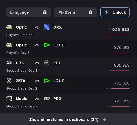 Nessa sexta-feira (16), o duelo entre LOUD e OpTic havia atingido a maior audiência do VALORANT Champions 2022 com mais de 870 mil espectadores simultâneos. Entretanto, a partida desse sábado bateu mais um recorde, com 1.020.683 milhão de espectadores simultâneos, de acordo com dados do Esports Charts.