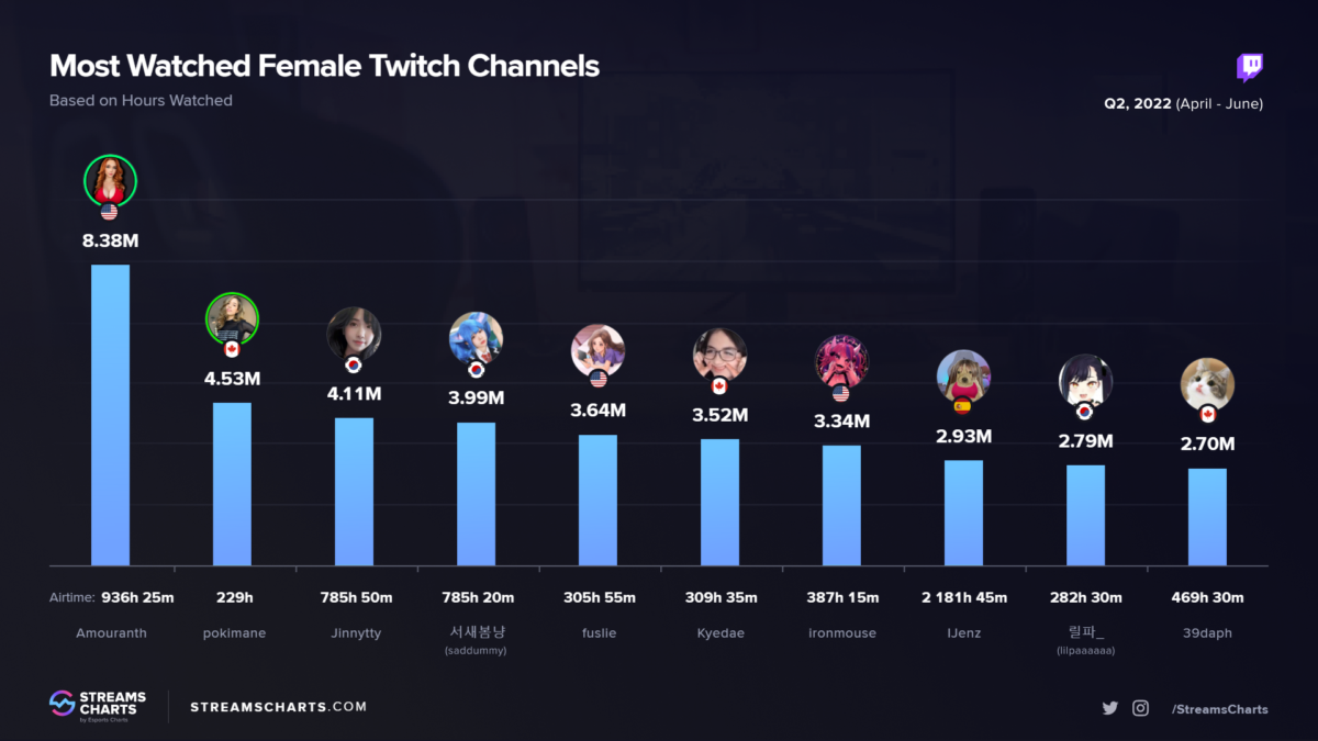 Dentre tantos temas abordados por Pokimane durante as transmissões, um deles é VALORANT. Das criadoras de conteúdo que aparecem na lista, ela se tornou a criadora de conteúdo do FPS da Riot Games melhor posicionada. Na frente dela apenas Amouranth, com 8,38 milhões de horas assistidas.