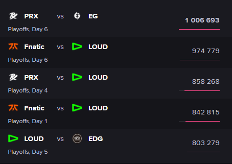 Segundo os dados divulgados pela plataforma Esports Charts, a partida entre Paper Rex e Evil Geniuses, pela final da chave superior, quebrou o recorde de visualizações do torneio. Com mais de 1 milhão de espectadores simultâneos, a disputa superou a partida entre Paper Rex e LOUD, que somou mais de 850 mil pessoas sintonizadas ao mesmo tempo.