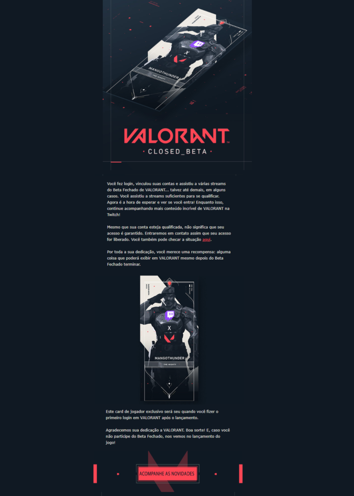 “Você fez login, vinculou suas contas e assistiu a várias streams do Beta Fechado de VALORANT… talvez até demais, em alguns casos. Você assistiu a streams suficientes para se qualificar. Agora é a hora de esperar e ver se você entra! Enquanto isso, continue acompanhando mais conteúdo incrível de VALORANT na Twitch! Mesmo que sua conta esteja qualificada, não significa que seu acesso é garantido. Entraremos em contato assim que seu acesso for liberado. Por toda a sua dedicação, você merece uma recompensa: alguma coisa que poderá exibir em VALORANT mesmo depois do Beta Fechado terminar“, diz o e-mail