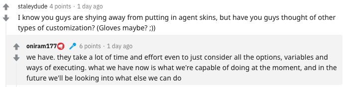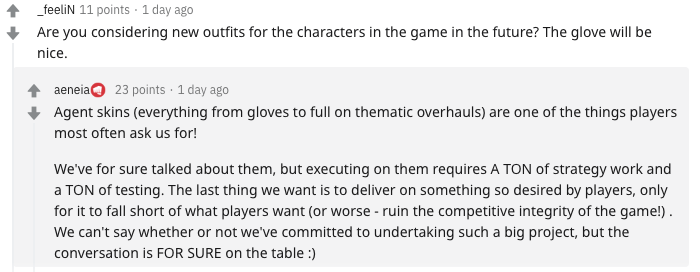 Os Rioters são questionados sobre skins de agentes com muita frequência. O assunto é trazido desde os primórdios do beta fechado do FPS, entretanto a equipe demonstra muita resistência no assunto.