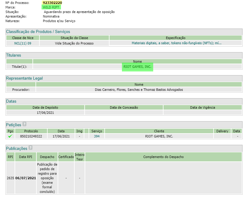 Segundo o registro no INPI, a Riot Games pediu a averbação da marca Wild Rift, o jogo mobile da produtora, similar ao League of Legends. Em suas especificações existem sugestões, que o game deve conter NFTs e criptomoedas dentro de seu jogo.