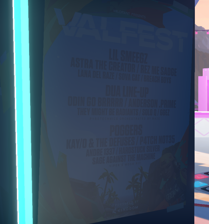 O ponto alto do laboratório (para mim) é o poster anunciando a primeira edição do VALFEST. O festival de música do VALORANT conta com grandes nomes como, Astra The Creator, Lana Del Raze e KAY/O & The Defuses. Confira: