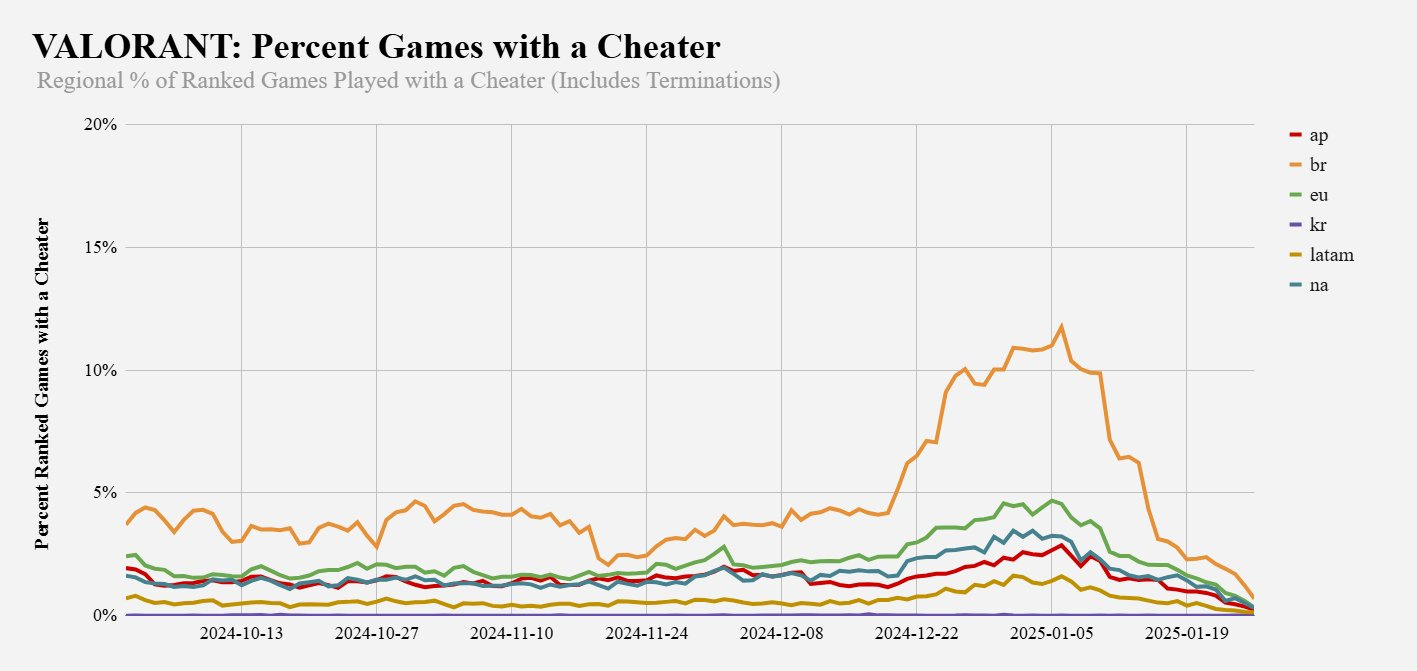 No comunicado, Phillip Koskinas, anti-cheater beaseado em dados na equipe do Vanguard na Riot, informa que, no Brasil, 10% das partidas ranqueadas, são acompanhadas de um cheater.