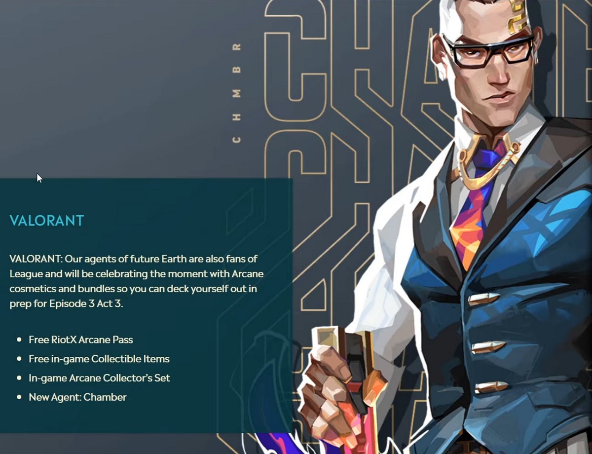 A Riot Games revelou nesta segunda-feira (1, o projeto RiotX Arcane, uma experiência mundial, multijogos e multiplataforma, criada especialmente para celebrar a chegada de Arcane, série animada da desenvolvedora em colaboração com a Netflix. O VALORANT será representado por Chamber, o próximo agente a ser lançado no FPS.