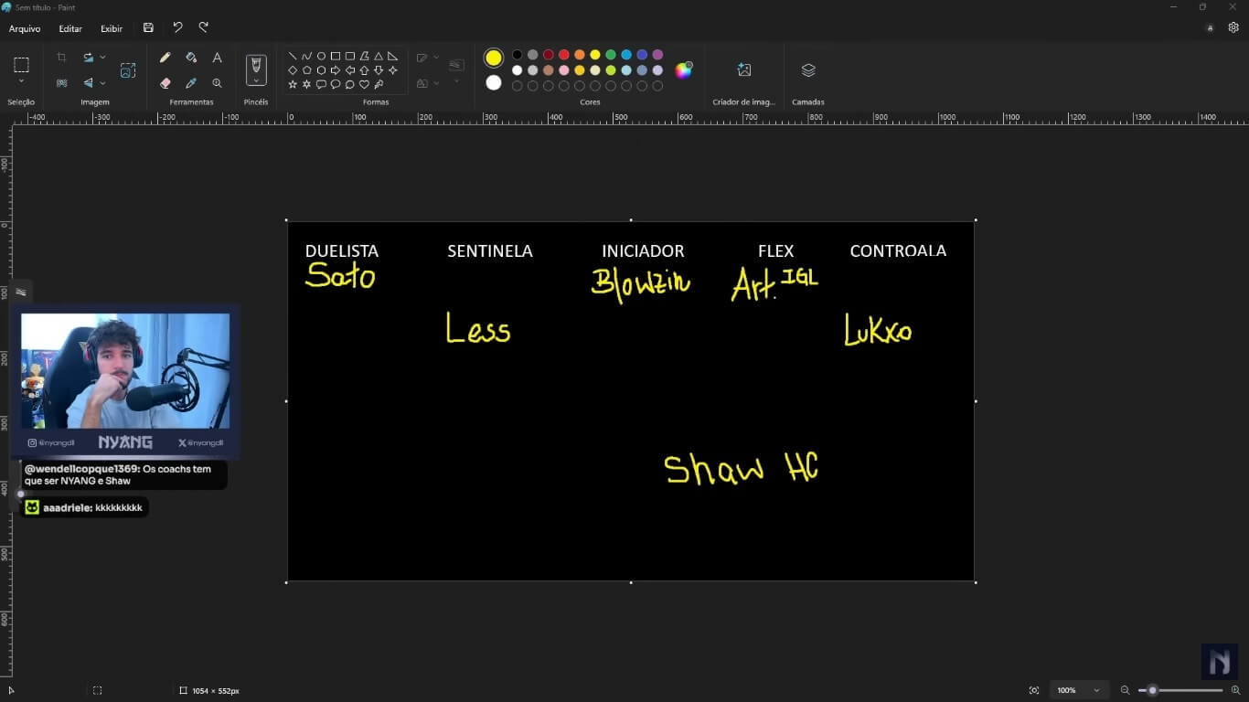 Nesta quinta-feira (5), Nyang publicou novo vídeo em seu canal pessoal no YouTube, onde analisou as possíveis opções de jogadores que podem compor a escalação do Brasil em uma convocação futura para disputa da Copa do Mundo de Esports. Juntamente com sua comunidade e seguidores, o caster e ex-jogador profissional de VALORANT montou o time com o seguinte elenco: